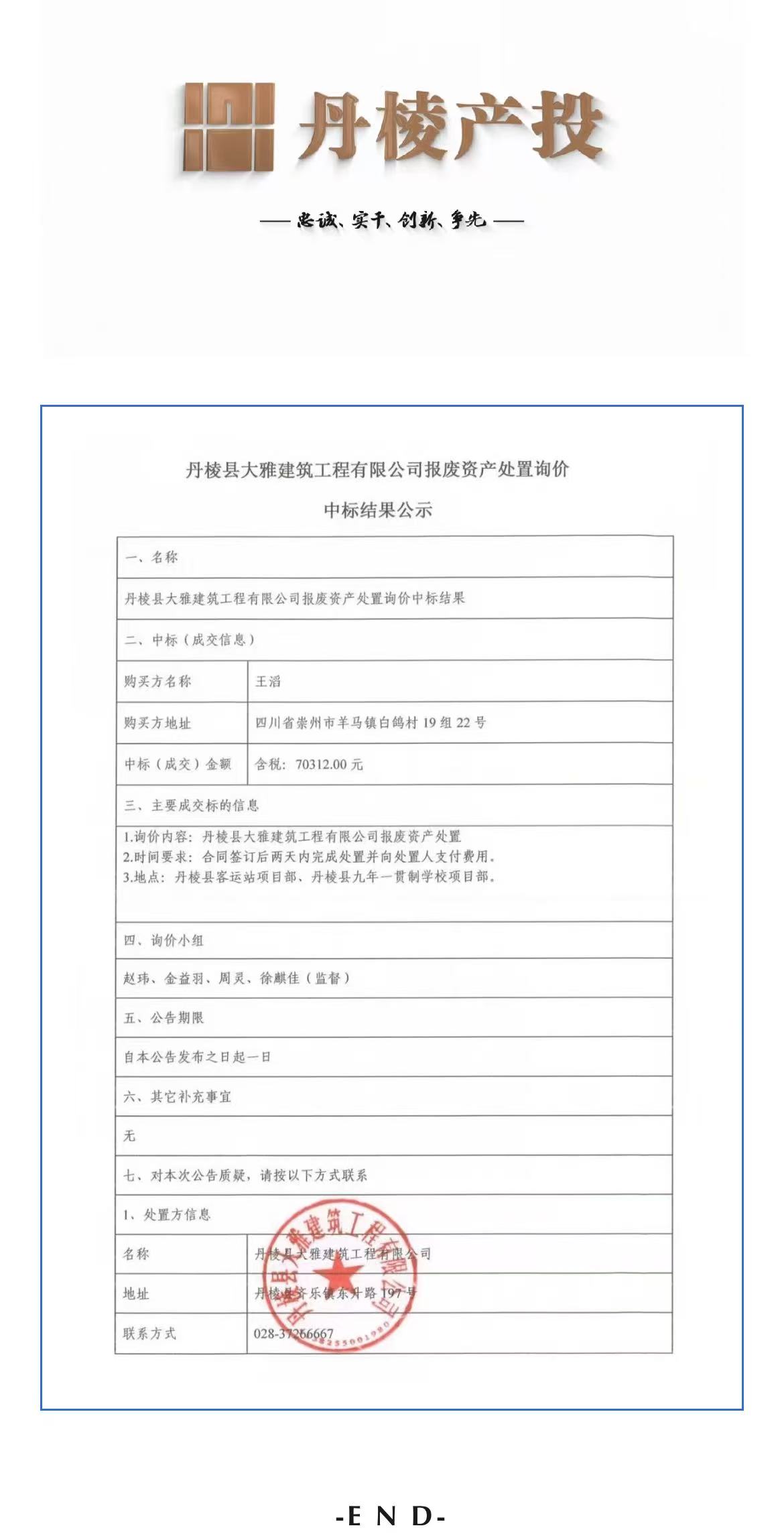 丹棱縣大雅建筑工程有限公司報(bào)廢資產(chǎn)處置詢價(jià)中標(biāo)結(jié)果公示